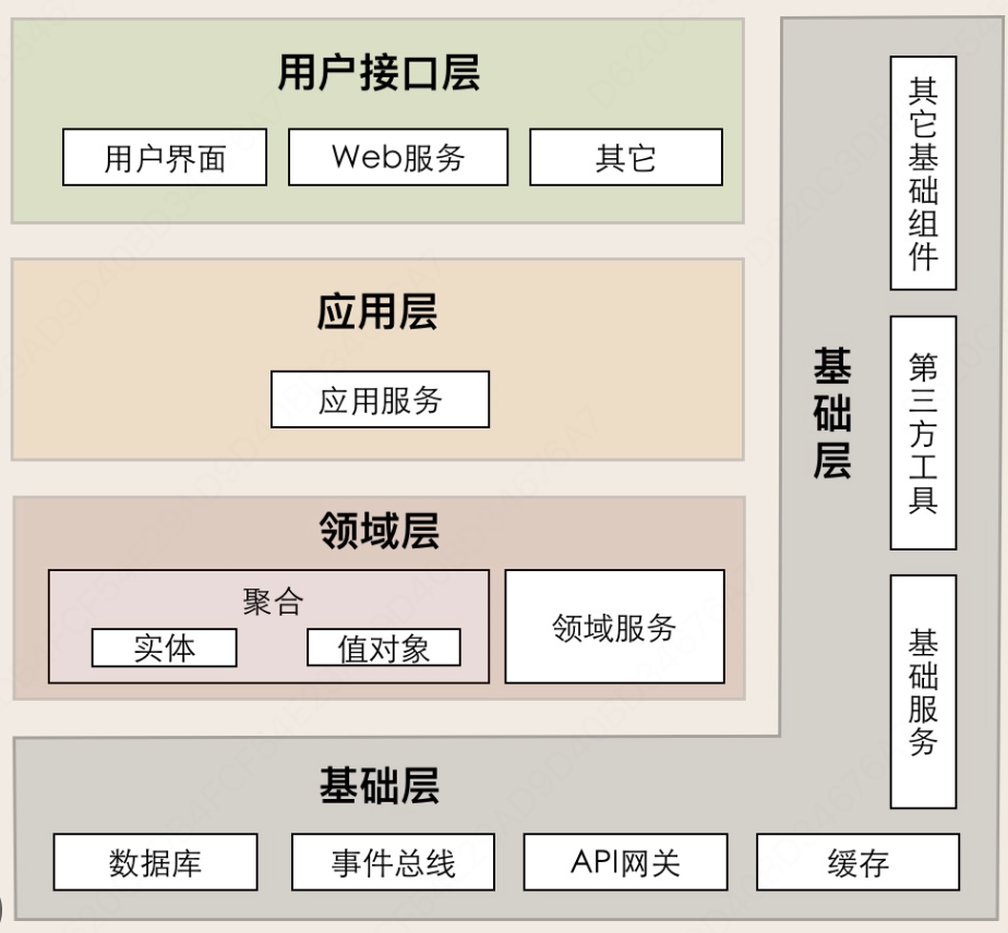 - 基础层:是贯穿所有层的,它的作用就是为其它各层提供通用的技术和基础服务,包括第三方工具、驱动、消息中间件、网关、文件、缓存以及数据库等。比较常见的功能还是提供数据库持久化。