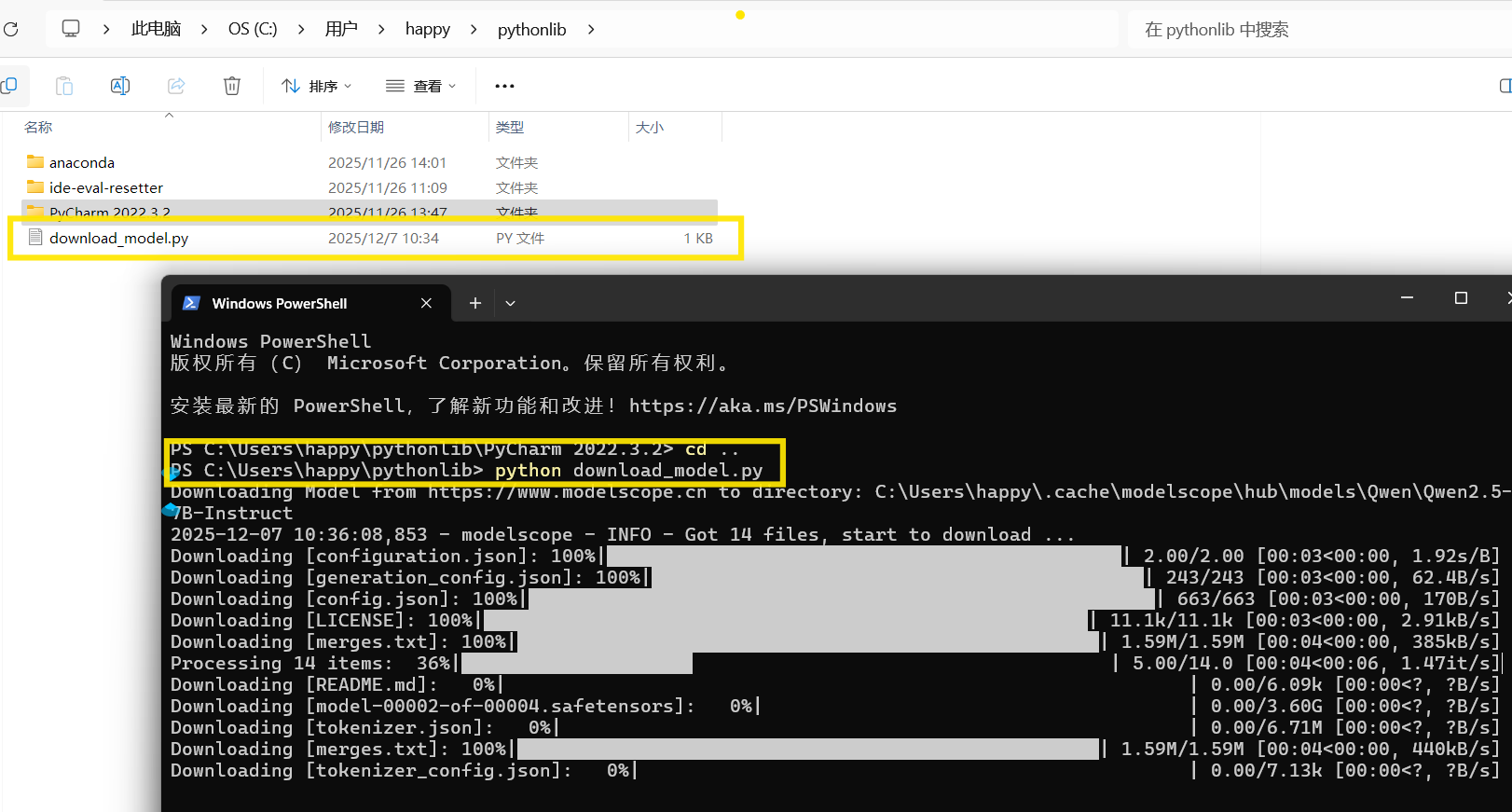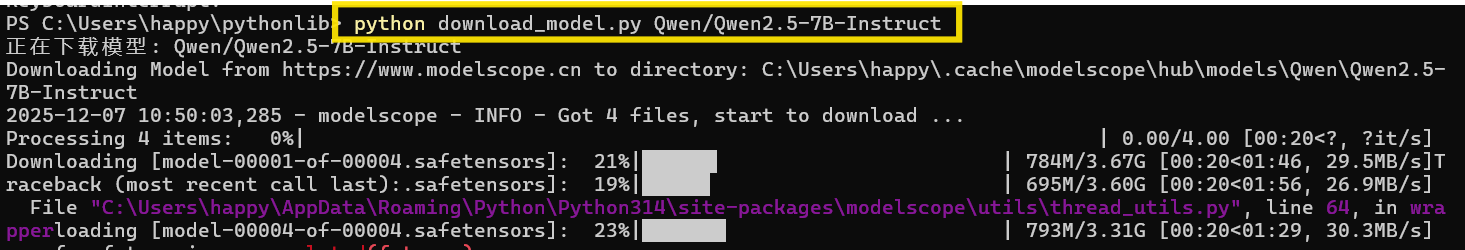 保存,在当前目录下打开终端运行命令:python download_model.py Qwen/Qwen2.5-7B-Instruct