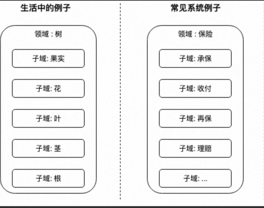 - 核心域: 重要业务的领域。业务属性重、企业特点重,决定产品或企业核心竞争力的能力子域就是核心子域。比如树的果实、花 这些树上重要的部位。比如保险领域就是承保、收付、理赔等。