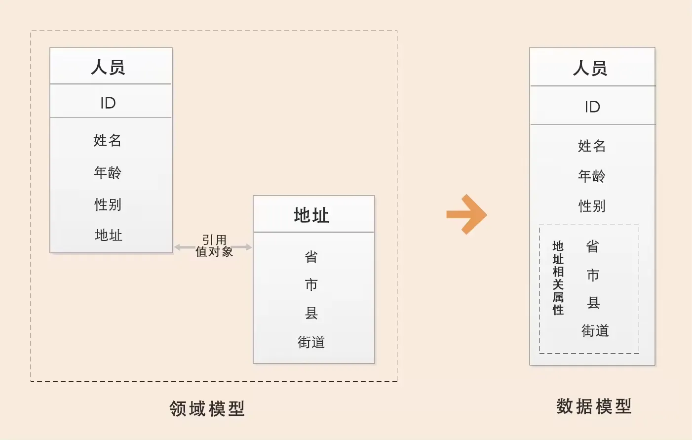 值对象本质上就是一个集合。这个集合里面有若干个用于描述目的、具有整体概念和不可修改的属性,常见的实体如: 地址,将“省、市、县和街道”等属性,构成一个地址的属性集合,这个属性集合就是地址值对象。