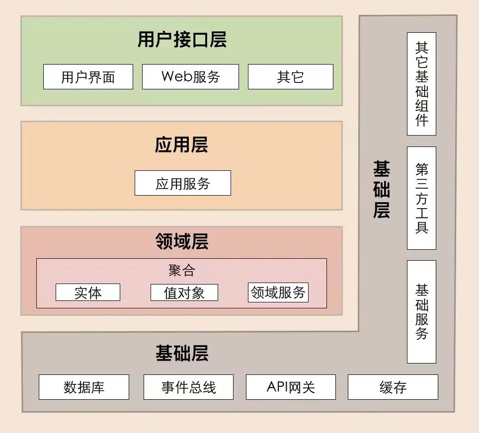 - 基础设施层:作用就是为其它各层提供通用的技术和基础服务。包括但不限于: 第三方工具、驱动、消息中间件、网关、文件、缓存以及数据库等
