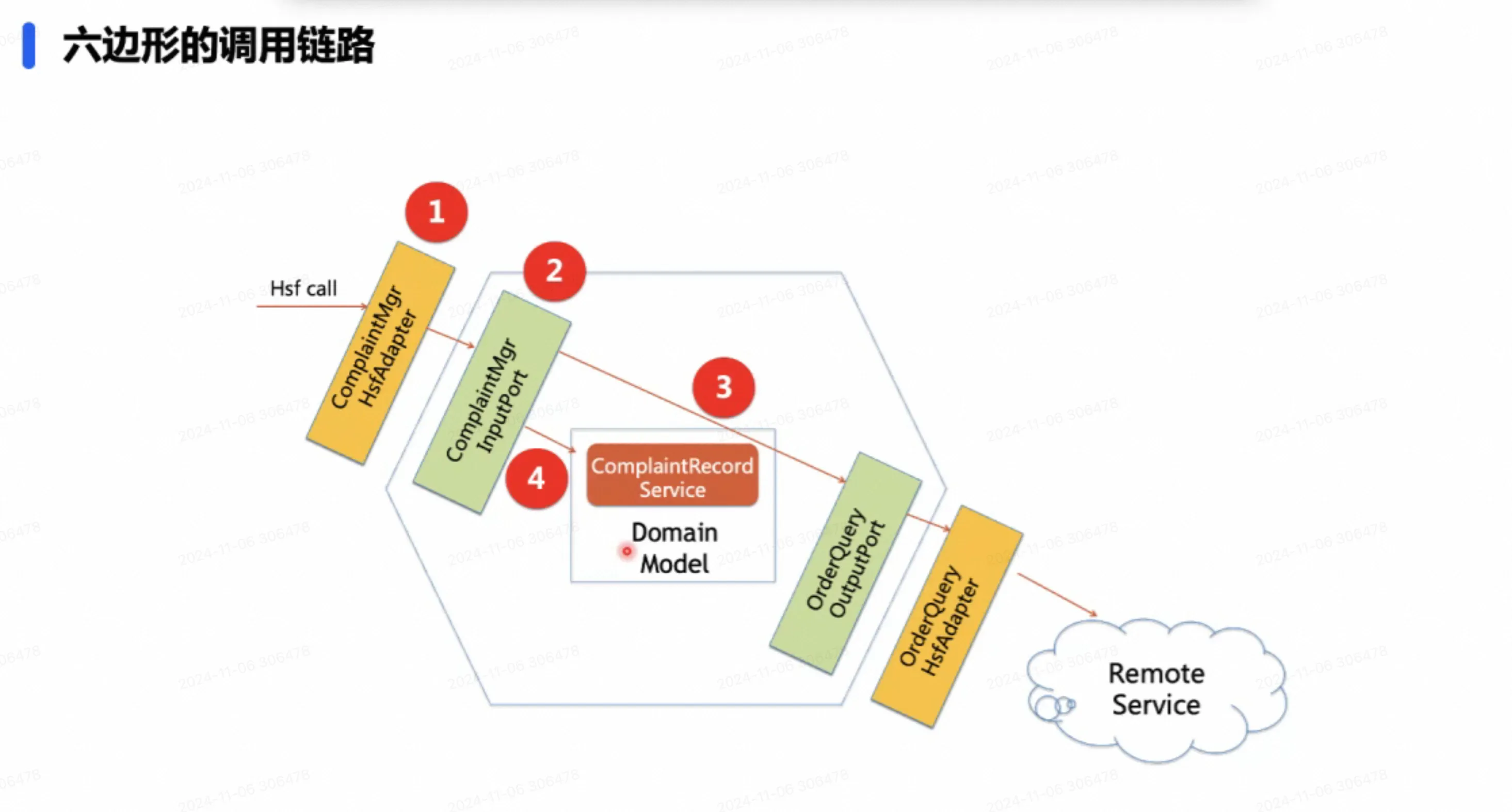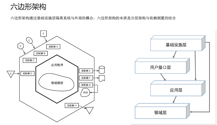 - 外六边形: 完成外部应用、驱动和基础资源等的交互和访问。对前端应用以 API 主动适配的方式提供服务,对基础资源以依赖倒置被动适配的方式实现资源访问 (和整洁架构思想一致)