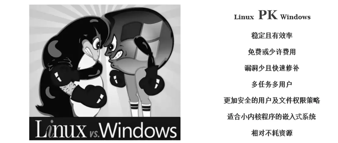 为了更直观地展示 Linux 和 Windows 之间的差异, 我们进行了以下的归纳和比较, 详见下图。这些差别是刘遄老师基于工作经验总结的,或许你现在不完全认同,但没关系,可以 在学习中慢慢体会。