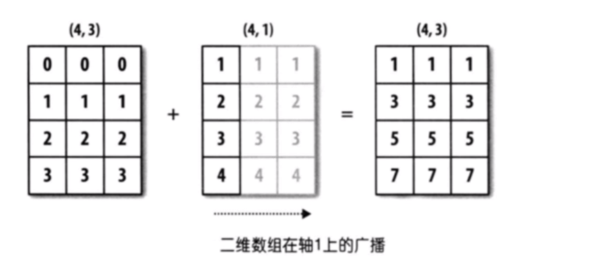 # 直接相加(NumPy自动广播arr2到(4, 3)形状)