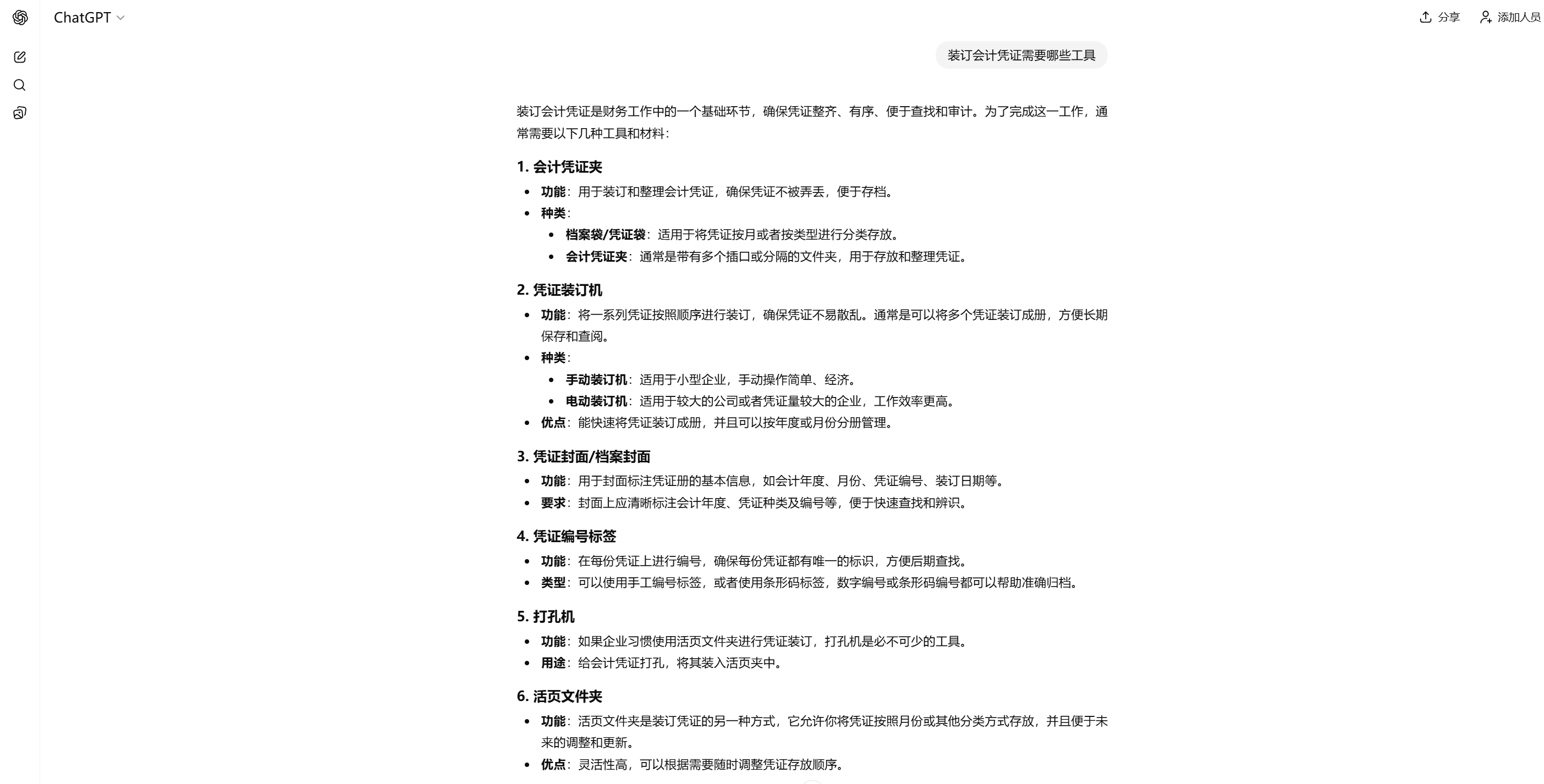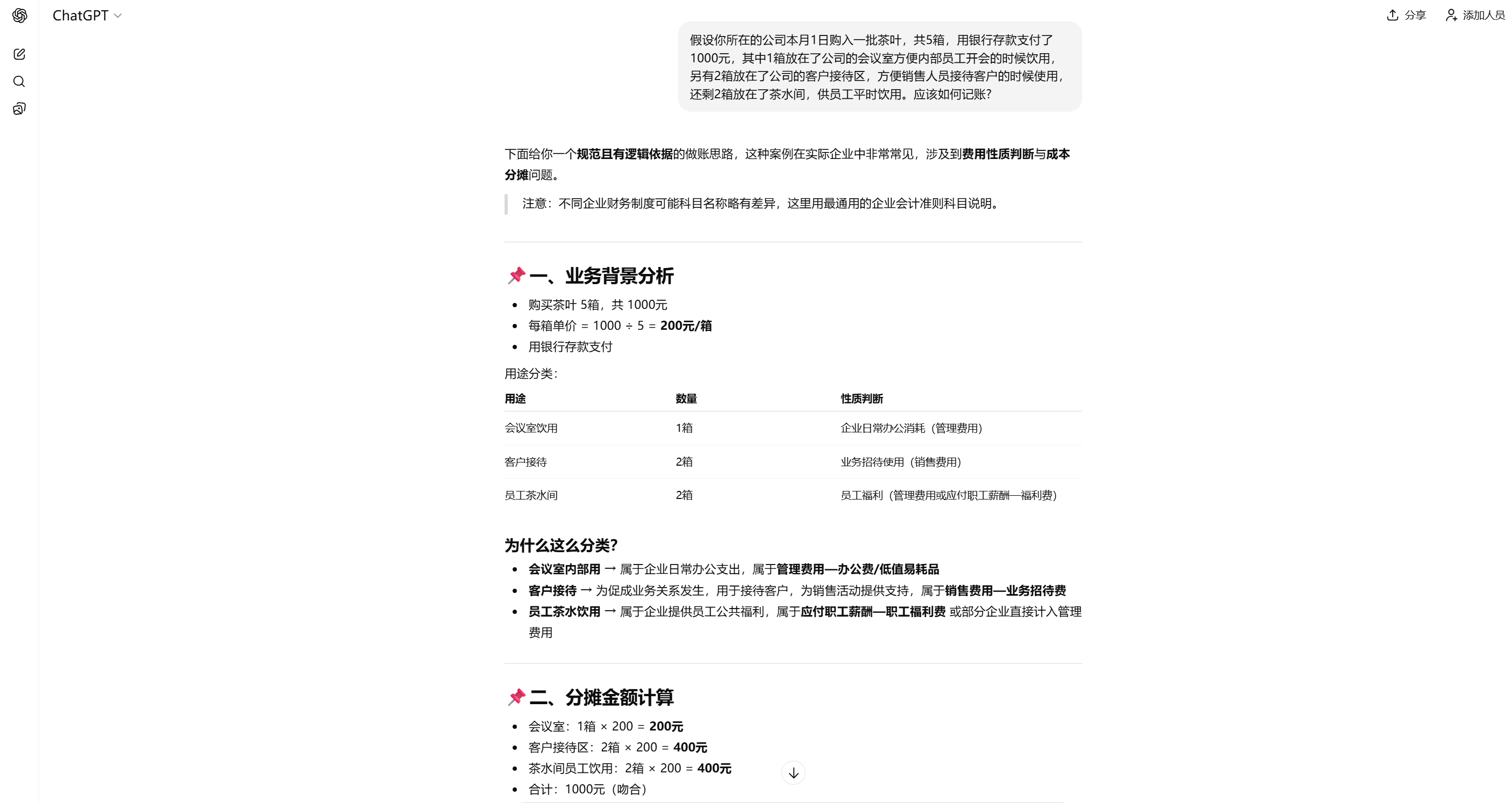 假设所在的公司本月1日购入一批茶叶,共5箱,用银行存款支付了1000元,其中1箱放在了公司的会议室方便内部员工开会的时候饮用,另有2箱放在了公司的客户接待区,方便销售人员接待客户的时候使用,还剩2箱放在了茶水间,供员工平时饮用。应该如何记账? 根据ChatGPT的指示,可以很快在财务软件上记下这一笔购人的分录。当然,ChatGPT解释得比较详细,可以把这几笔分录合并,借记三笔费用,统一贷记1000。