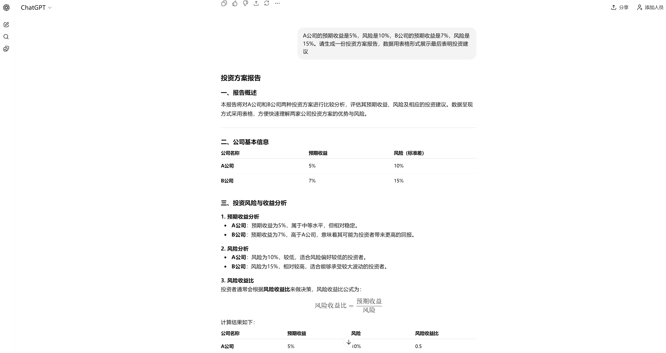 如果公司打算进行投资,例如,我们可以提问 我们正在考虑投资A公司和B公司,A公司的预期收益是5%,风险是10%,B公司的预期收益是7%,风险是15%。请生成一份投资方案报告,数据用表格形式展示最后表明投资建议,然后,ChatGPT就会生成一份详细的投资方案。