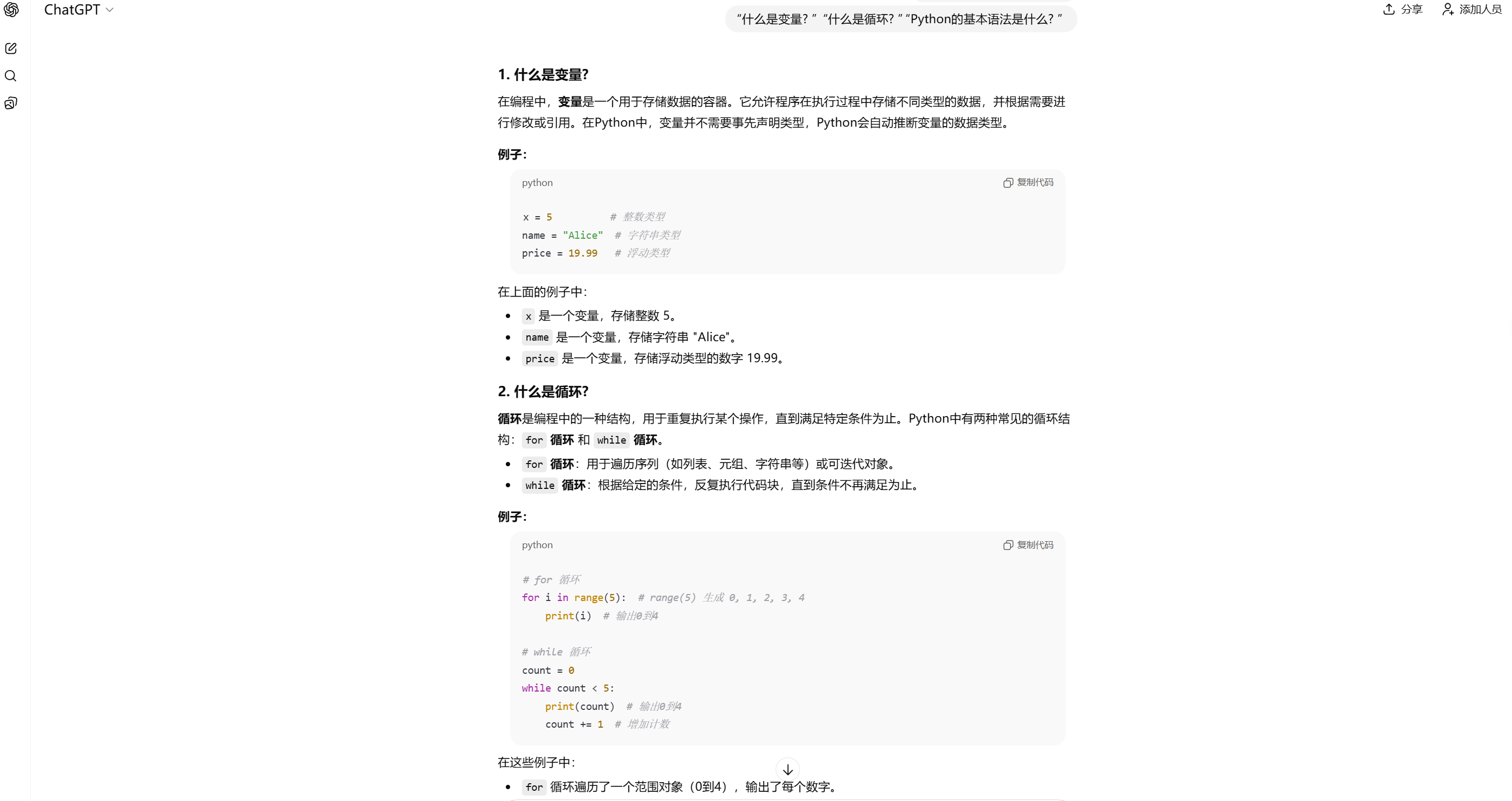 最一开始,可以先用ChatGPT学习编程的基本概念和语法。假如现在我们就是一个编程新手,不知道从哪里开始学习,就可以向ChatGPT提问什么是变量? 什么是循环? Python的基本语法是什么? 等。