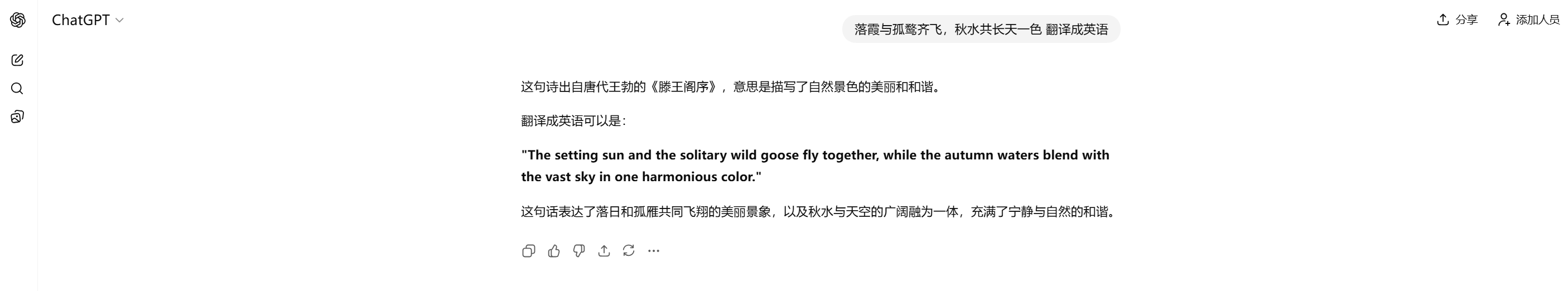就以经典名句落霞与孤鹜齐飞,秋水共长天一色来说,如果找简单的翻译工具来翻译,得到的结果是The sunset and the lone duck fly together, and the autumn water grows in the same color as the sky。这几乎就是直接翻译,没有什么意境,甚至听起来很难懂。