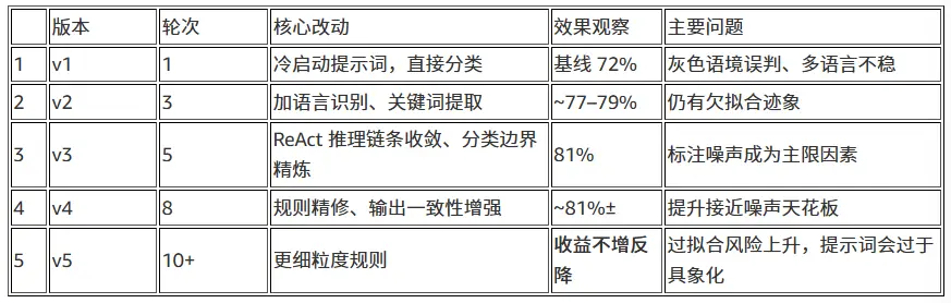 数据质量是上限,提示词优化是下限: 我们使用的人工审核数据存在多人、分多日完成、缺乏复核等问题,导致标注结果本身带有噪声。在这种情况下,模型的准确率“天花板”就会受到影响。换句话说,提示词优化能逼近人工水平,但要进一步突破,还需要客户改善数据标注流程。