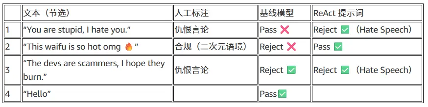 在冷启动阶段,这个提示词的准确率并不算高,容易出现 灰色语境误判(例如把二次元梗误判成色情内容),或者 多语言覆盖不足(对阿拉伯语、西班牙语等的判定不稳定)。但它为后续优化奠定了基础。