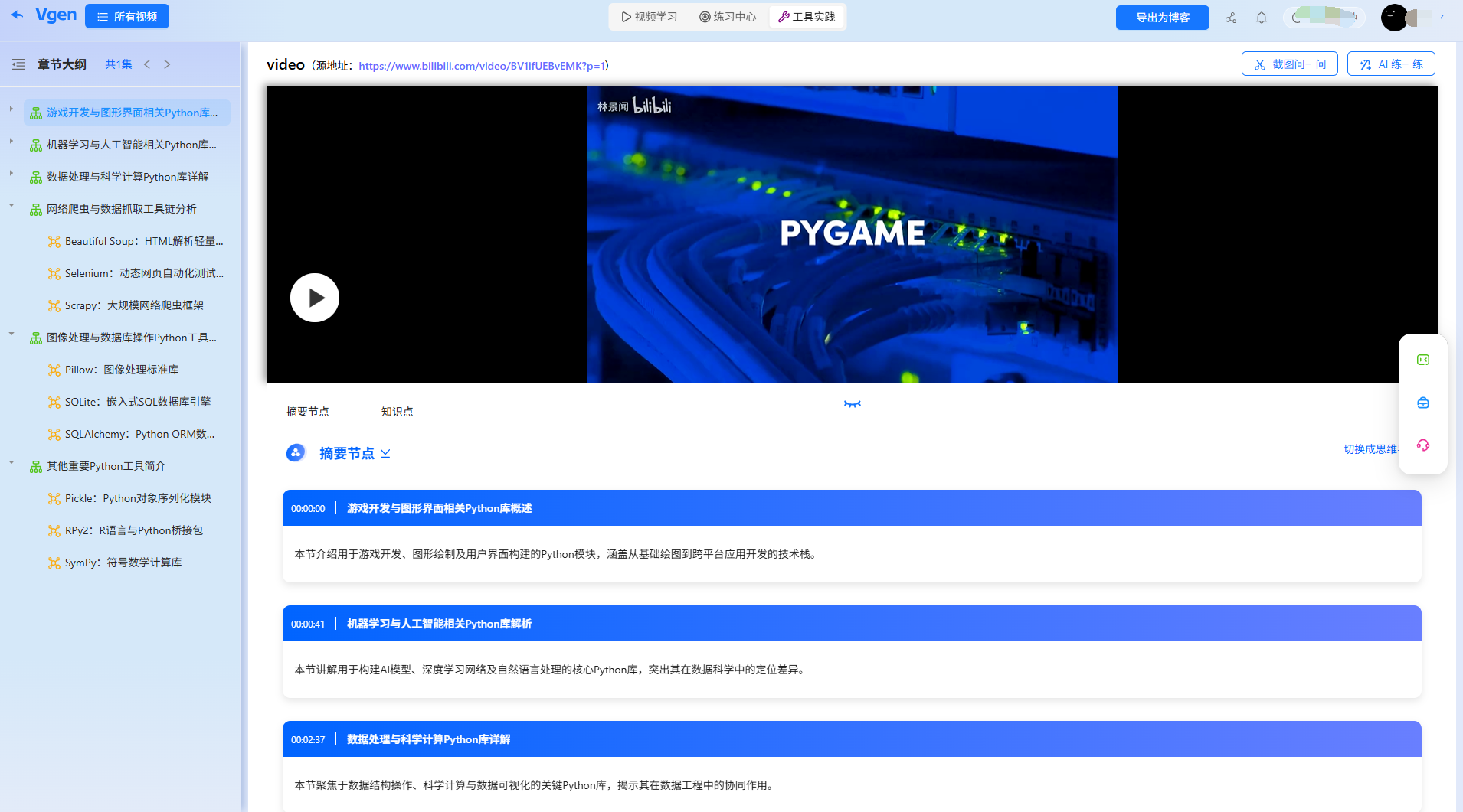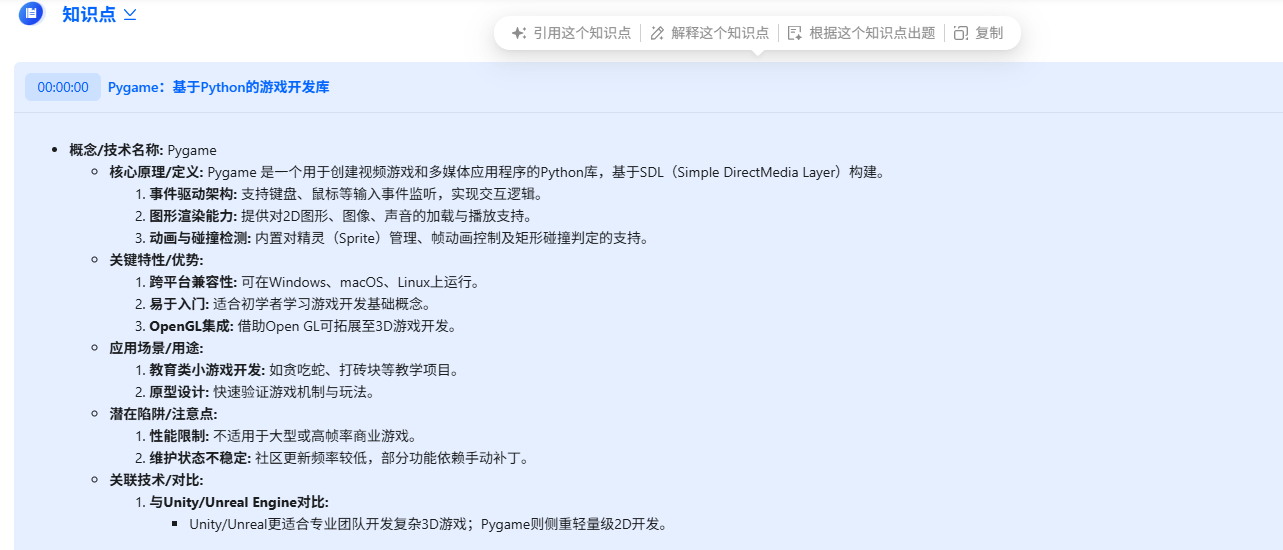 每个摘要节点下面都附了关键知识点,比如游戏开发部分,直接标出核心库是Pygame,备注“适合2D小游戏开发,入门简单,有完整的音效、图形接口”,后面还贴了主播提到的“用Pygame做贪吃蛇只需300行代码”的案例。点了下时间戳,直接跳转到视频对应片段,反复看了两遍就摸清了Pygame的定位,比自己瞎暂停效率高太多。