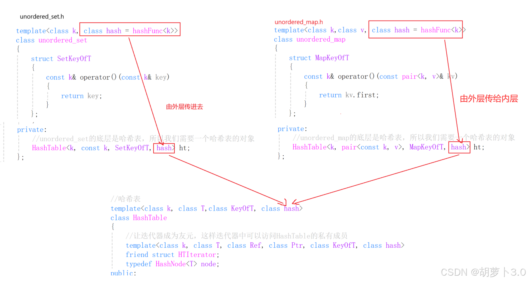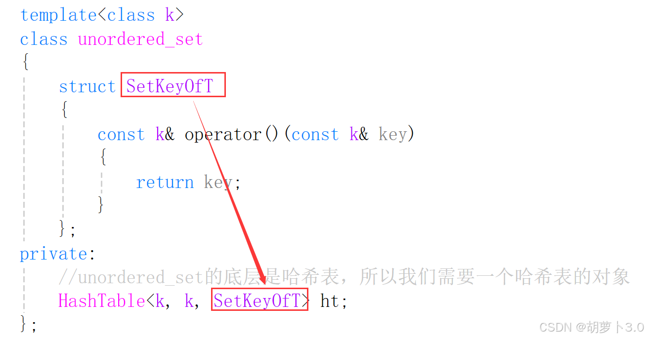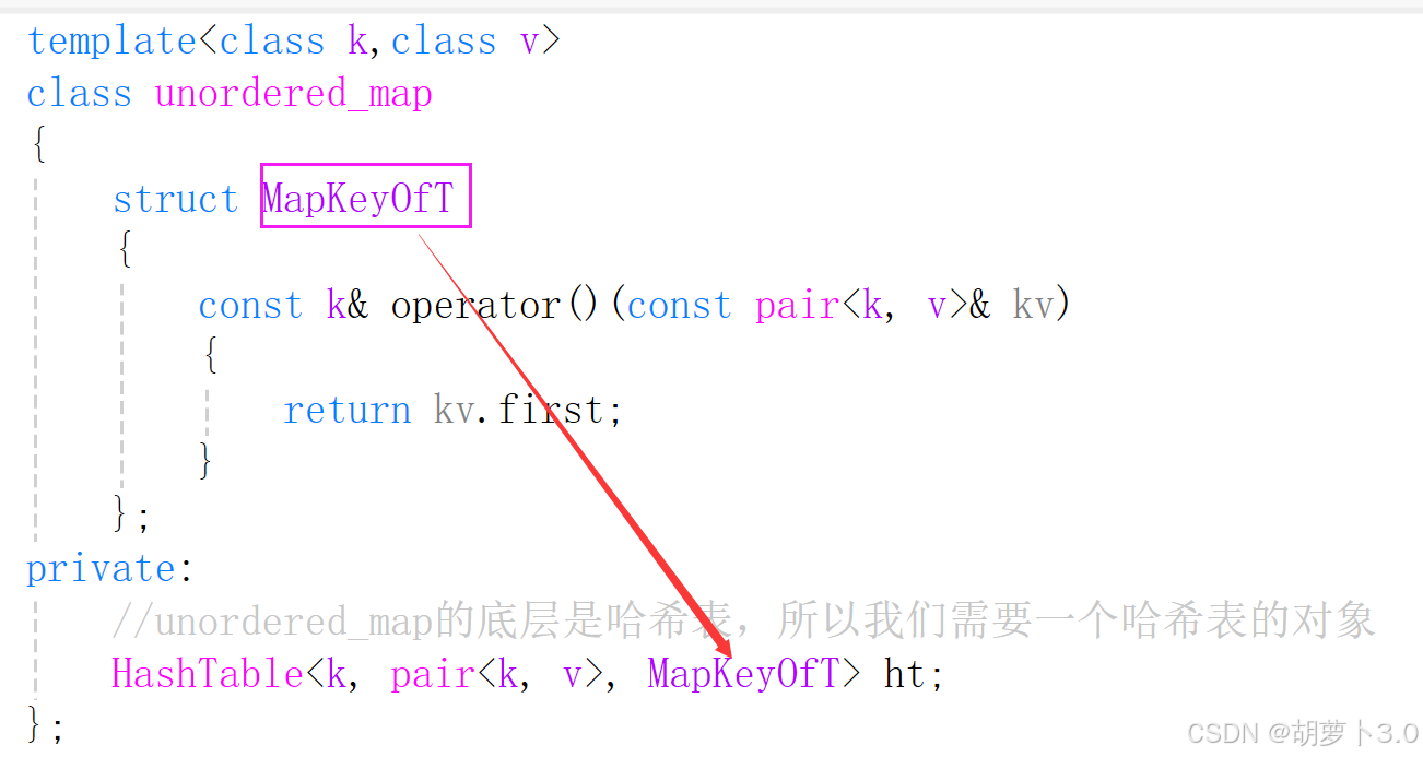 那此时我们就需要在unordered_map和unordered_set中各自写这么一个仿函数——用来将各自数据中的key给提取出来,然后将这个仿函数作为第三个模板参数传给哈希表