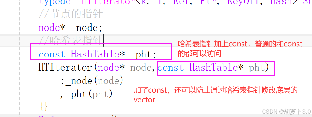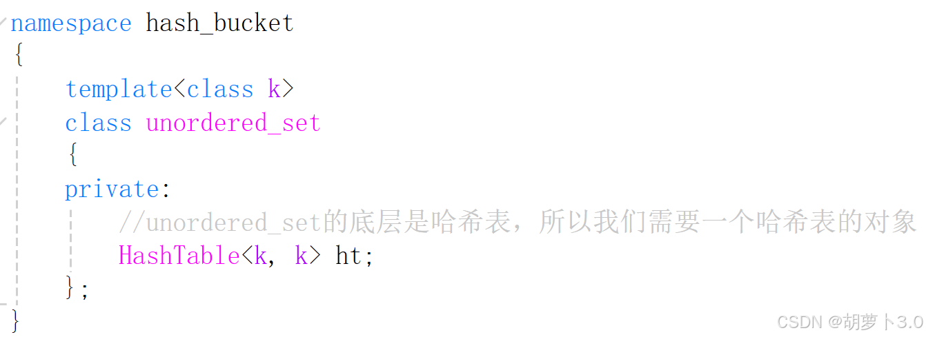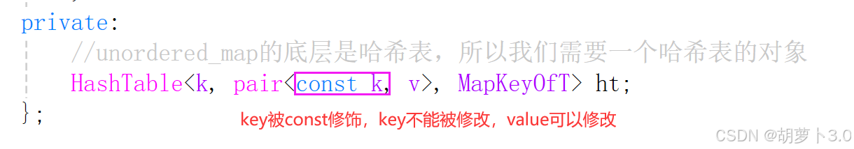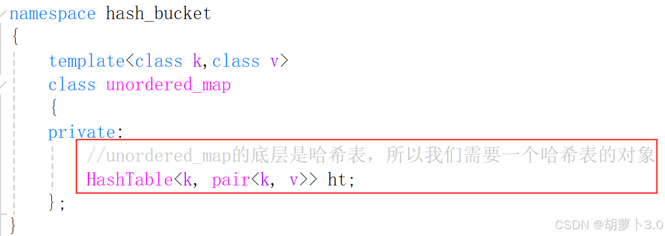 由于std::unordered_map和 std::unordered_set 的底层通常使用红黑树实现,因此在我们自定义的 unoredered_map 和 unordered_set 类中,需要在私有成员区域定义一个哈希表对象作为底层容器。