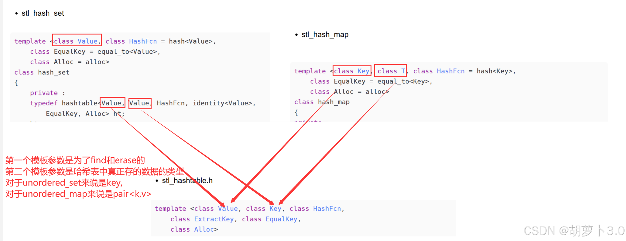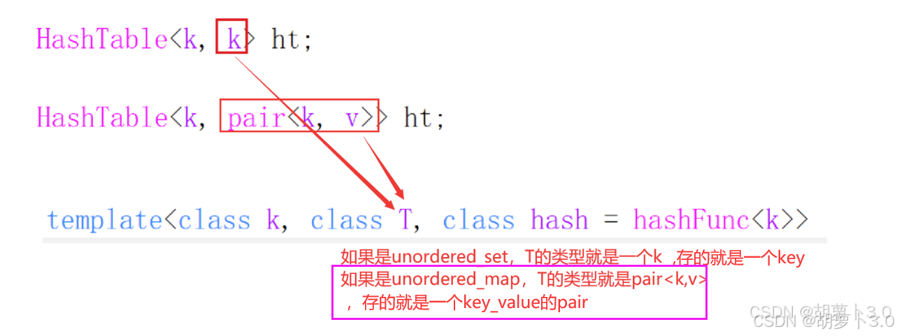 - 因为find和erase传参传的是key,对于unordered_set而言调用insert/find/erase传的k和T的两个参数是一样的,但是对于unordered_map而言是不一样的,insert传的是pair,但是find/erase是key