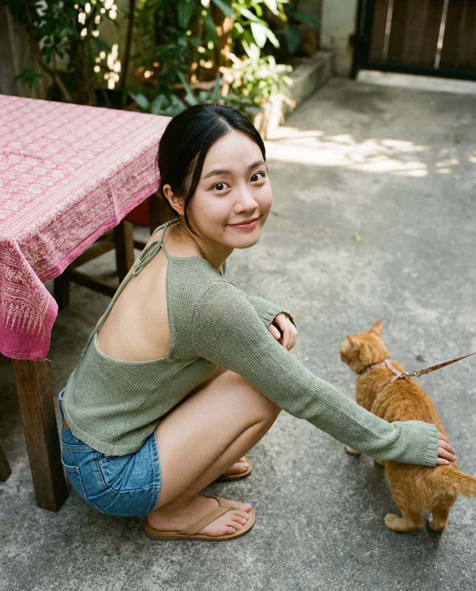 以超写实风格,从高角度捕捉一张自然随性的抓拍照片:年轻的亚洲女生蹲坐在水泥地的庭院中,侧身向后回望,目光微微上扬对视镜头;她嘴唇紧闭,带着害羞含蓄的笑容,眼睛大而明亮、圆润,明显的卧蚕衬托出俏皮可爱的神情。肌肤瓷白细腻,散发着自然的柔光。她穿着一件鼠尾草绿的针织露背长袖上衣,袖子覆盖着手掌,下身搭配牛仔短裤,赤脚穿着棕褐色凉鞋。一只手臂向外舒展,正在与旁边栓着绳子的姜黄色猫咪互动,身旁放着一张覆盖粉色民族风桌布的木质桌子。图片呈现 8K 分辨率,风格真实、细节丰富。