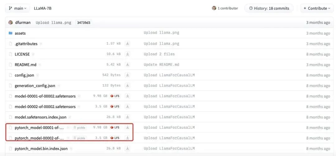 我们以 LLaMA-7B 为例,这个大模型参数量约为 70 亿,假设每个参数都是一个 fp32,即 4 个字节,总字节就是 280 亿字节,则 280 亿字节/1024(KB)/1024(MB)/1024(GB) = 26.7GB,当然这是原始的理论值,我们再往下看。因为实际存储 weight 权重参数会存 fp16,所以模型大小继续减半为 13.35GB。但是部分 layer norm 等数据会保留源格式 fp32,因此实际会稍微有所增加到 13.5GB 左右,我们从开源的 LLaMA-7B 的实际的存储结果来看,是符合上面的计算的: