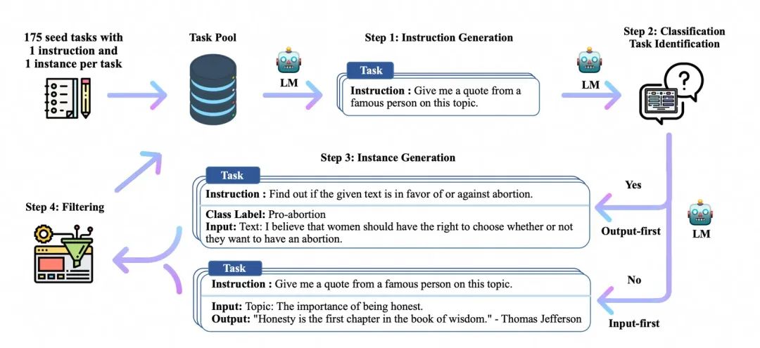生成指令数据的流程由四个步骤组成。1)指令生成,2)识别指令是否代表分类任务,3)用输入优先或输出优先的方法生成实例,4)过滤低质量数据。