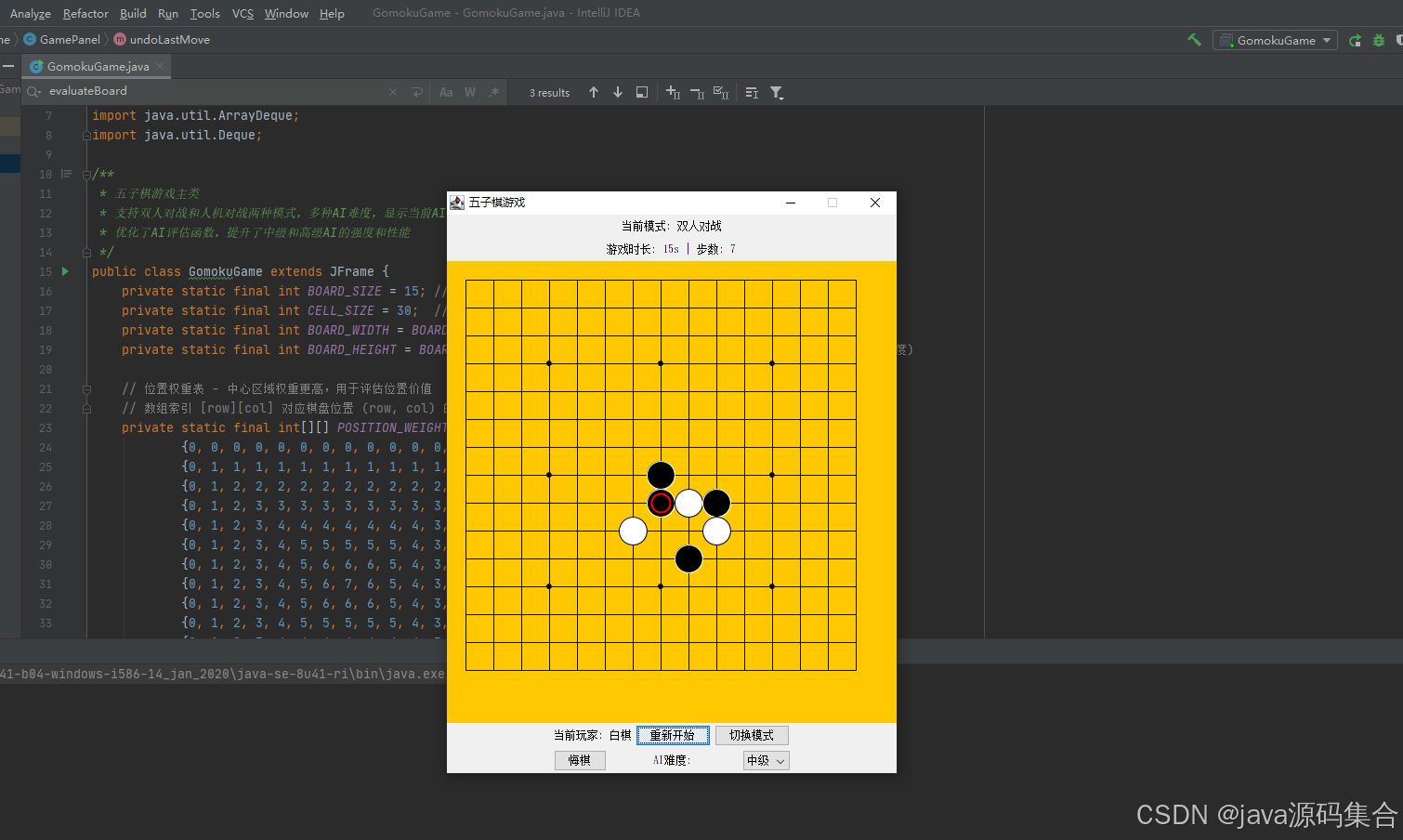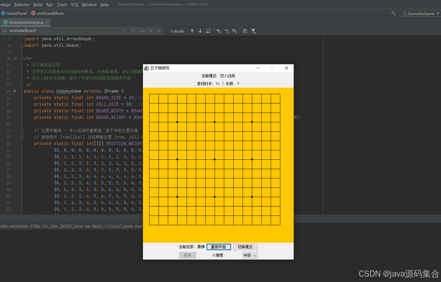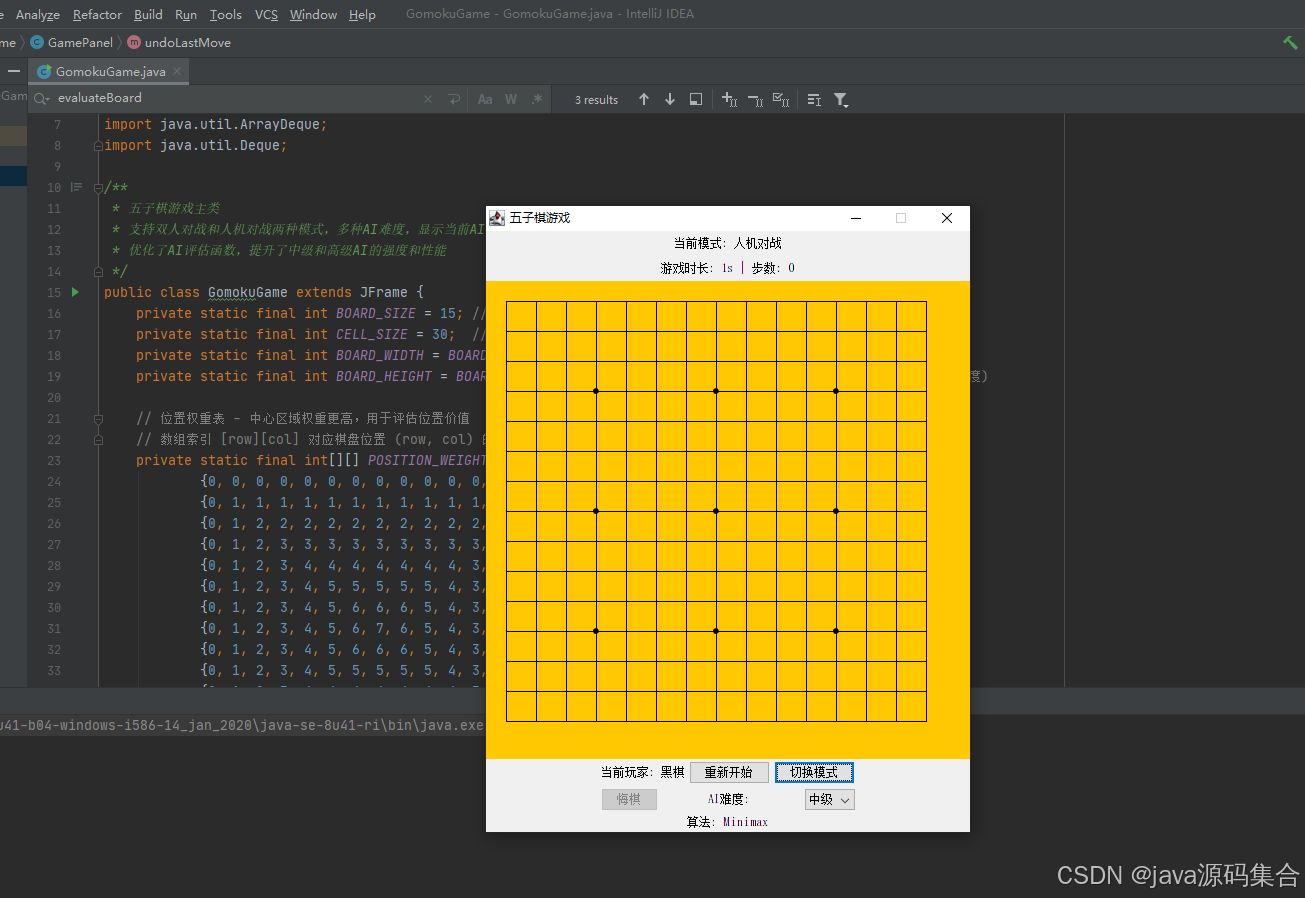 GomokuGame:主类,负责创建窗口、初始化UI组件、管理游戏状态(如模式、难度、步数、时间)。GamePanel:继承自JPanel,是游戏的核心逻辑类,负责绘制棋盘、处理鼠标事件、管理棋盘状态、执行AI逻辑。