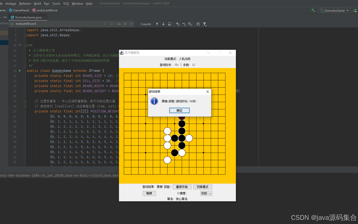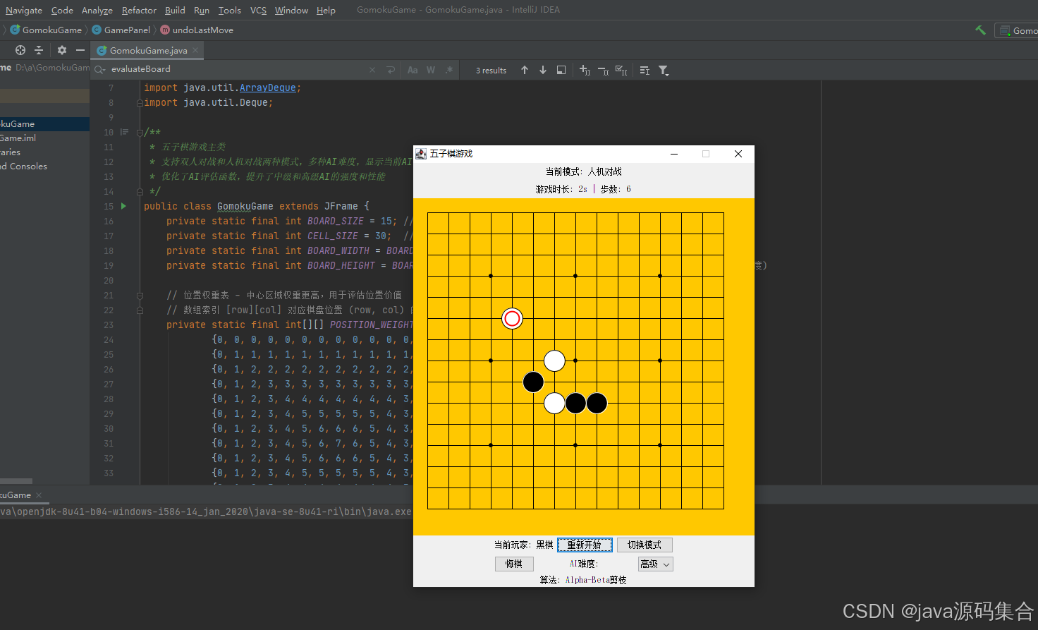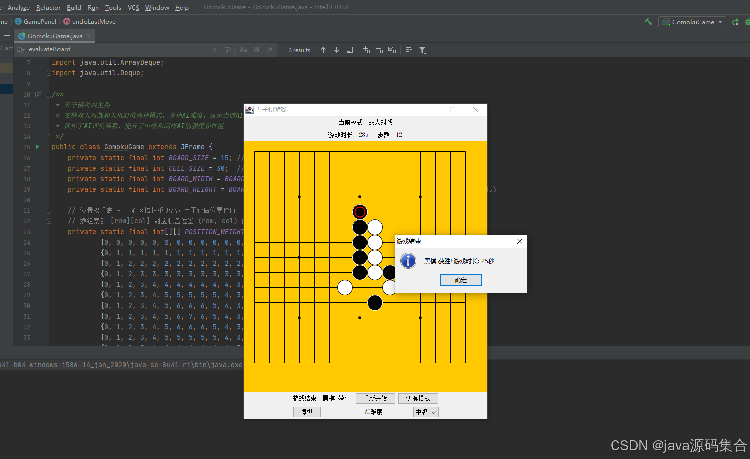 GomokuGame:主类,负责创建窗口、初始化UI组件、管理游戏状态(如模式、难度、步数、时间)。GamePanel:继承自JPanel,是游戏的核心逻辑类,负责绘制棋盘、处理鼠标事件、管理棋盘状态、执行AI逻辑。
