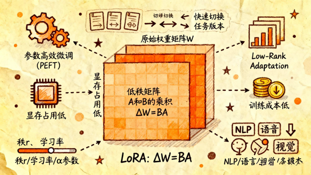 LoRA的适用范围也很广,不仅能用于NLP任务(比如文本生成、翻译),还能用于语音、视觉、多模态等领域。