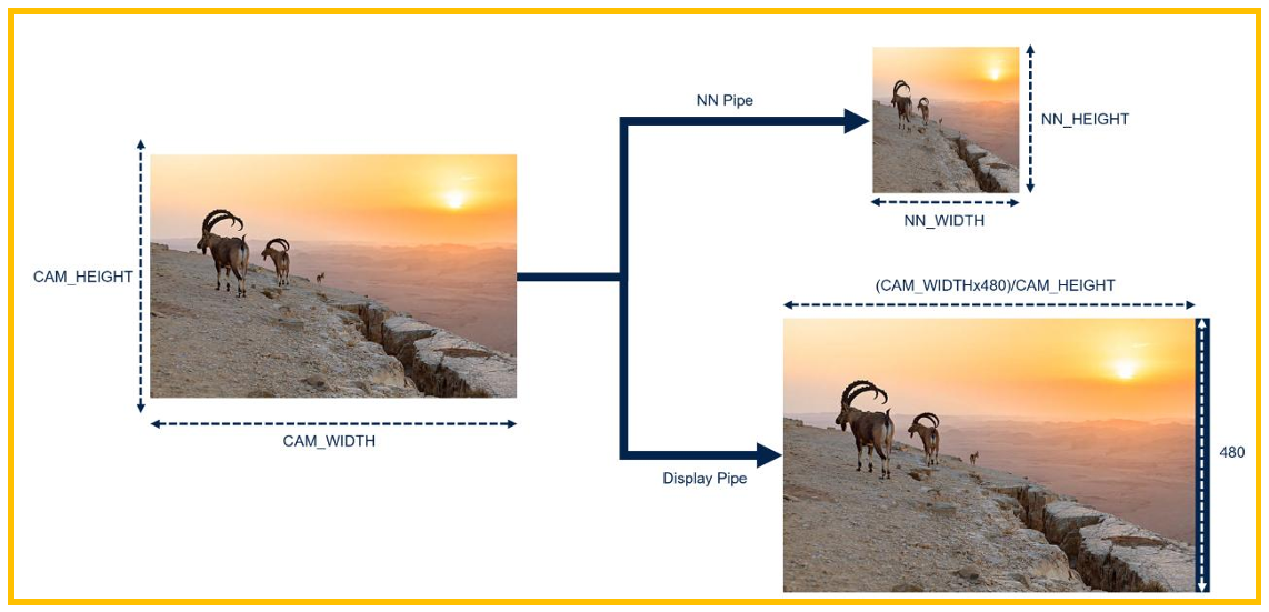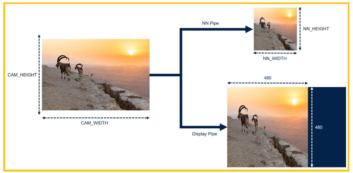 ASPECT_RATIO_FIT:该模式对于NN Pipe,会将原始图片压缩到NN输入的高和宽,但 由于NN需要的高宽比和摄像头的不一致,图片会发生变形,对于显示的display pipe,其使用 的和NN pipe的内容一致,但会放大到480x480的大小。