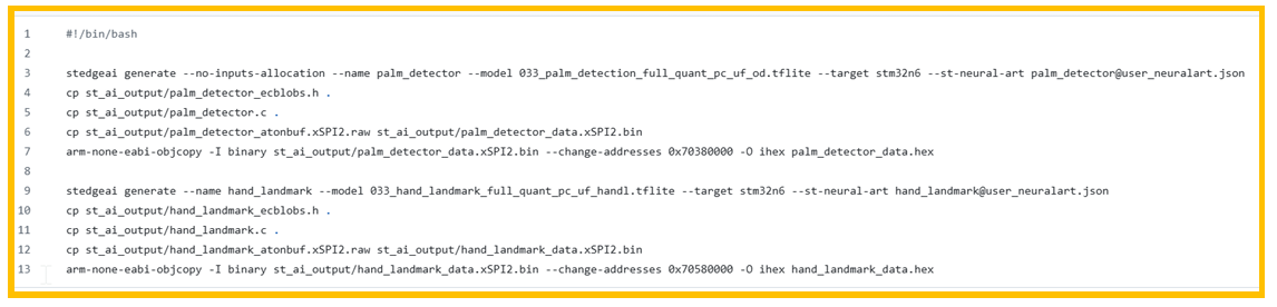 该脚本内主要使用stedgeai工具对模型进行转换,stedgeai generate指令会生成相 关.c, .h和模型权重文件。