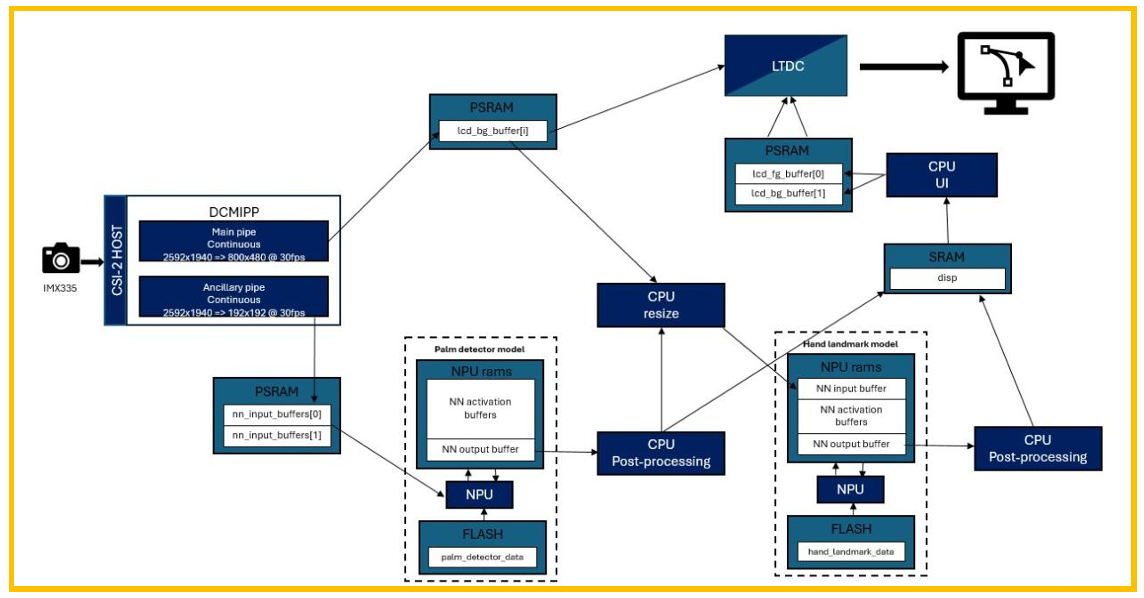 Hand landmark的数据流如上图所示,摄像头CSI接口输入2592x1940的数据流,经过 PIPE1转换为800x480,用于LCD进行显示,同时经过PIPE2转换为192x192的图片,放在 nn_input_buffer内,然后给第一个手掌检测模型,手掌检测模型进行后处理输出手掌的ROI区 LAT1609 LAT1609 - Rev 1.0 page 13/19 域以及旋转角度,然后使用CPU或GPU在用于显示的图片上进行Crop和Resize,将手掌区域 裁剪并压缩成第二个模型的输入形状,然后放入第二个关键点检测模型内进行推理,得到21个 关键点,与此同时,实时更新一些信息用于显示屏,画出手掌的框和关键点。