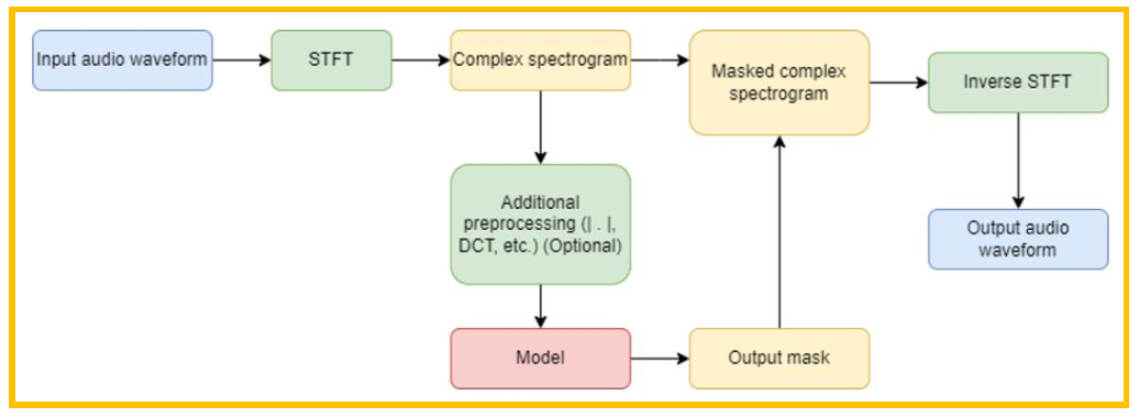 SE 处理的基本流程如上所示,输入是带有噪声的语音信号,先经过STFT得到复频域的幅度 谱和相位谱,然后对其进行额外的如DCT操作等,预处理完成后输入模型进行处理,得到输出 的mask,使用输出的mask对频域进行处理,再使用逆STFT变换,最后得到输出的音频。