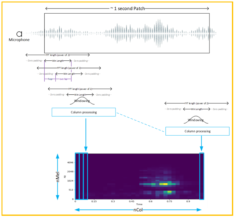 音频的预处理流程如上图1所示,首先做一段FFT,然后加窗,其后再对每列进行logMel 滤波,DCT等处理,之后使用一定的窗口进行移帧,对每一帧都进行同样的处理,最后在时间上 会得到上图1中的MFCC频谱。该流程是音频处理的通用特征工程,同样可以应用于KWS等应 用场景。