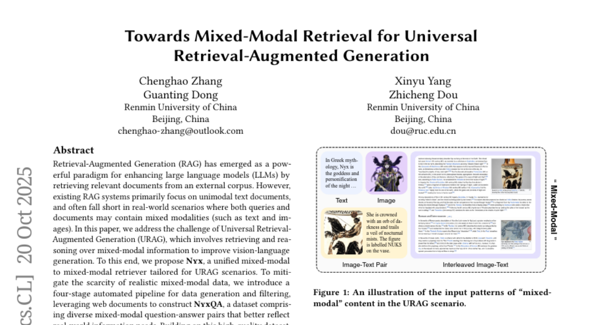 最近,中国人民大学信息学院的张承昊、董关廷、杨鑫宇和窦志成教授团队在这个问题上取得了重要突破。他们的研究成果《Towards Mixed-Modal Retrieval for Universal Retrieval-Augmented Generation》于2025年10月发表在计算机科学顶级会议WWW 2026上。有兴趣深入了解的读者可以通过arXiv:2510.17354查询完整论文。