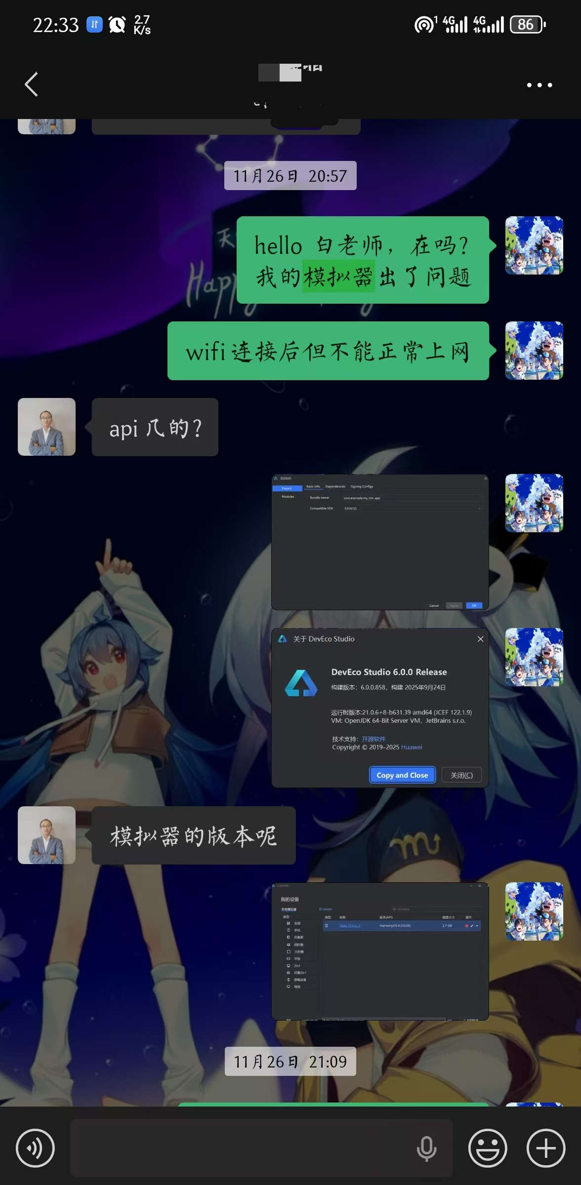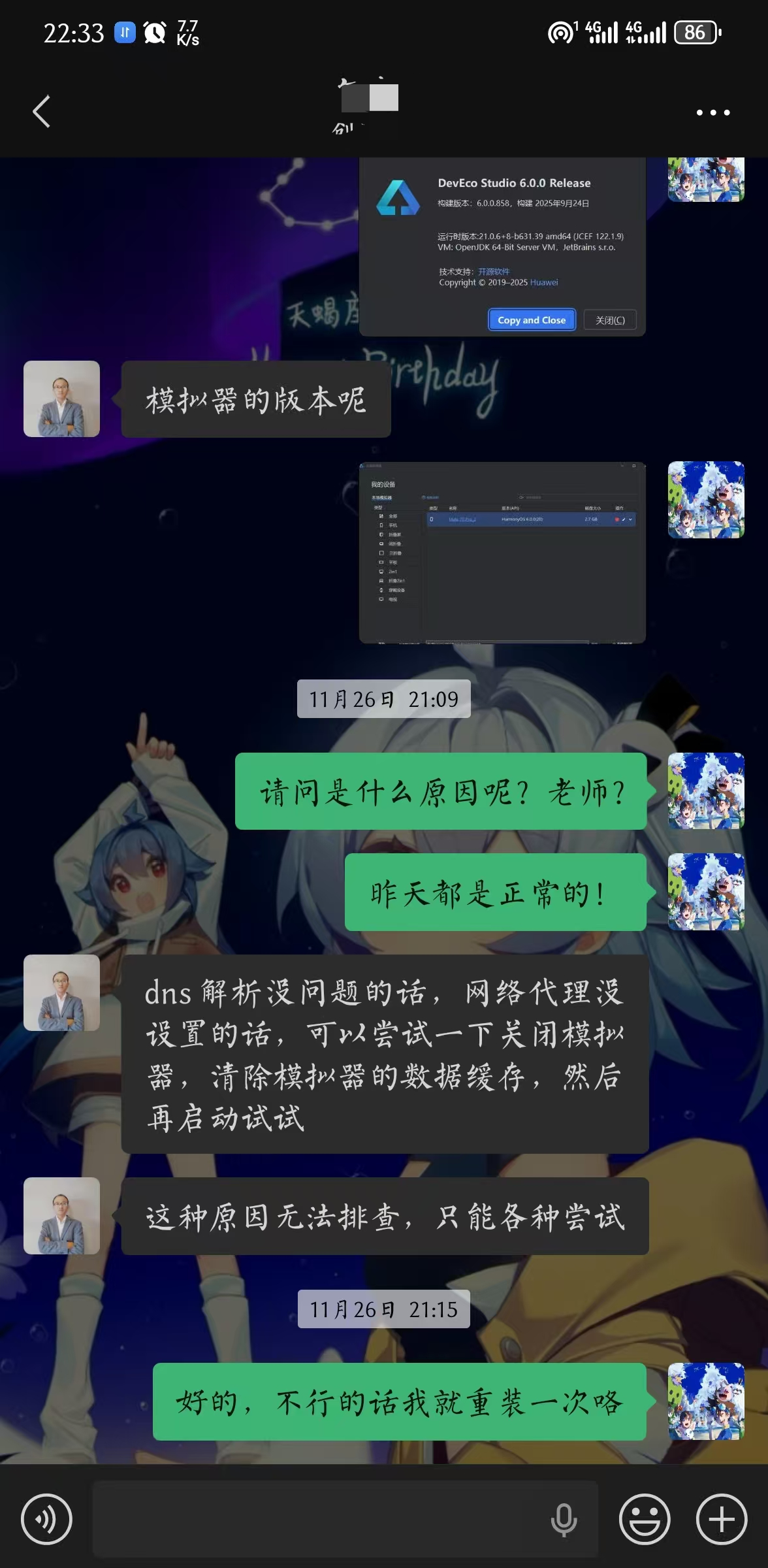 例如我遇到的错误有DevEco 模拟器 WiFi 异常,我查了官网手册,发现无法解决我的错误,我就去群里咨询,华为的老师给出很多相关报错原因,词汇很专业,我对此很多不理解,因为我没学过也不知道,所以排错起来,只能很多靠猜(不懂原理也就是问题本质)去问 ai 解决,找不到相关案例,因为客观因素太多了,这也是劝退自学开发主要原因,好在我原因得到自己解决,因为我对错误出现有感觉(也许开发久了自然就有了感受)手动将热点进行更换上网卡,得以正常!后面这个过程就叫DNS解析污染,一位懂的朋友给我解释了下,我也就迷迷糊糊的懂了的大概!