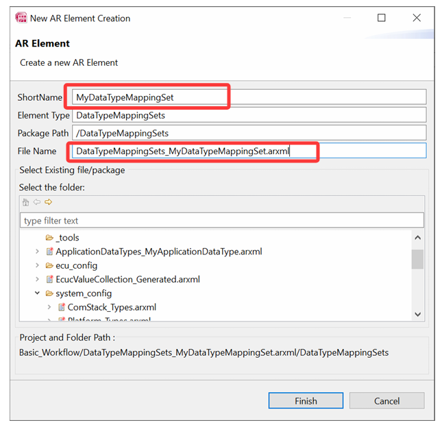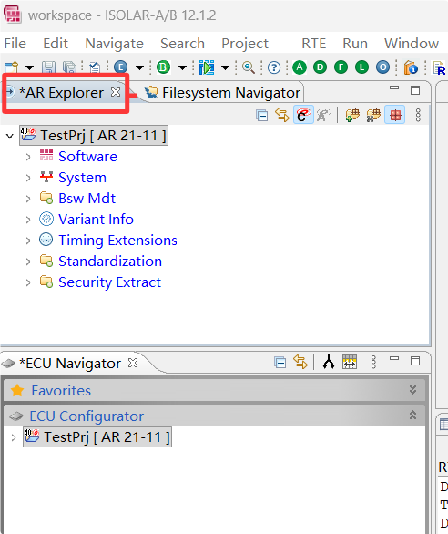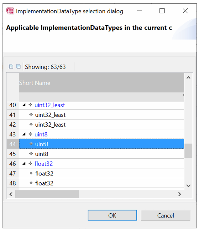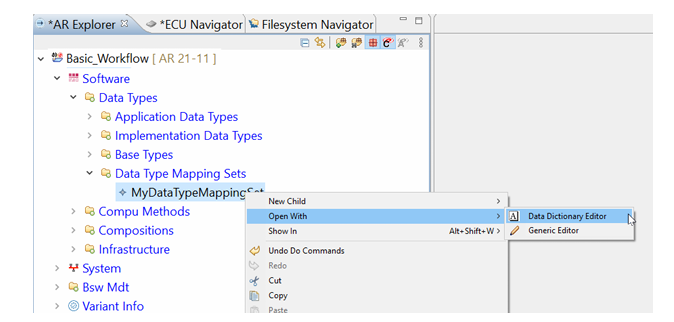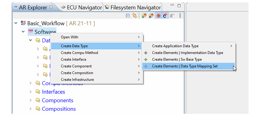切换到 AR Explorer 面板,展开 Software>Data Types。一个新的 RTA-CAR 项目包括标准的 AUTOSAR 实现数据类型和基本类型。