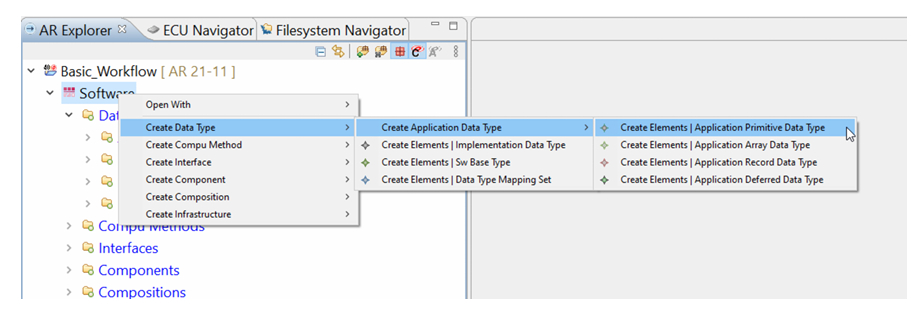 右键点击Software并选择: Create Data Type>Create Application Data Type>Create Elem ents | Application Primitive Data Type