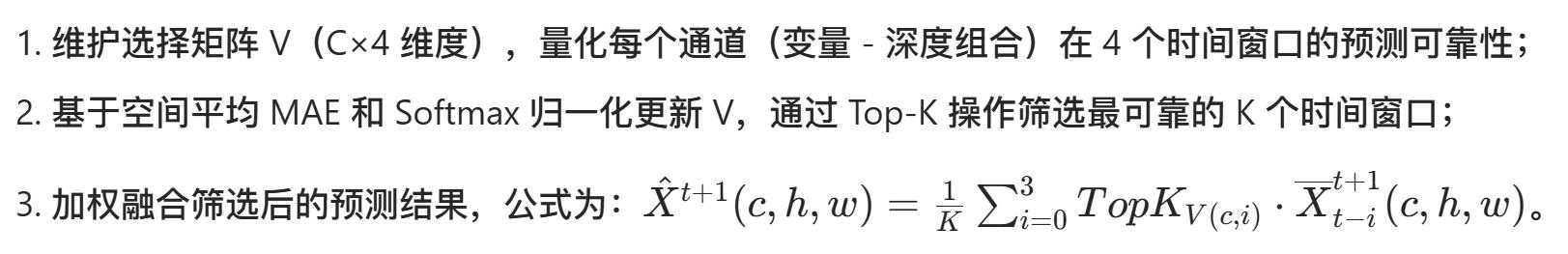 解码器的输出,经过 Mixture-of-Time(MoT)模块处理,得到预测结果。MoT模块的结构如下图所示。海洋表面变量 存在明显的日周期,需要长时序上下文捕捉昼夜变化规律;海洋深层变量(如 1000m 处的海流)演化缓慢,更依赖近期观测数据捕捉即时流场变化。MoT 模块通过 “变量特异性的时间窗口选择与融合”,解决这个问题。首先计算得到4个预测结果,再计算其与真实值的 MAE 误差,然后进行pooling 和Softmax,得到矩阵 V。如果 V(c,i)V(c,i)V(c,i) 越小,表明第 ccc 个通道在第 iii 个时间窗口的预测越可靠。MoT通过 Top-K 选择最可靠的 K 个时间窗口,再加权生成最终预测。