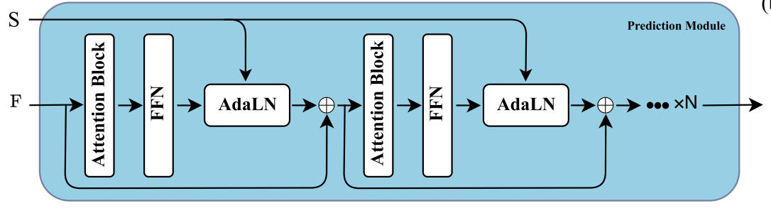 Prediction module 的结构如下图所示,是N个 attention + FFN + AdaLN 的模块,输出 初步的预测特征。AdaLN 是一个核心改进, 让层归一化的 γ\gammaγ 和 β\betaβ 由时空先验特征 FsF_sFs 动态生成,实现”上下文感知的归一化“。