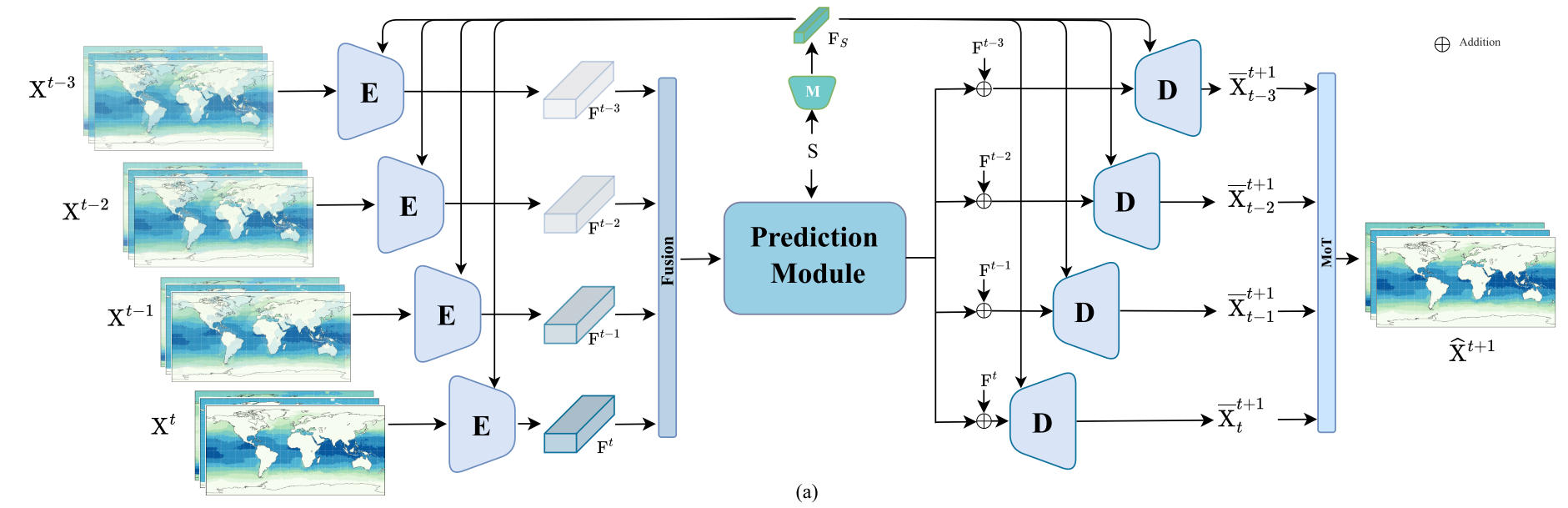 共享编码器E为卷积神经网络,将原始海洋状态(如温度、盐度的原始数值)转化为具有物理意义的低维 latent 特征。卷积参数会和FsF_sFs融合,让编码器E对不同区域、不同时间的海洋模式更敏感。编码器输出的特征拼接输入到 Prediction Module。