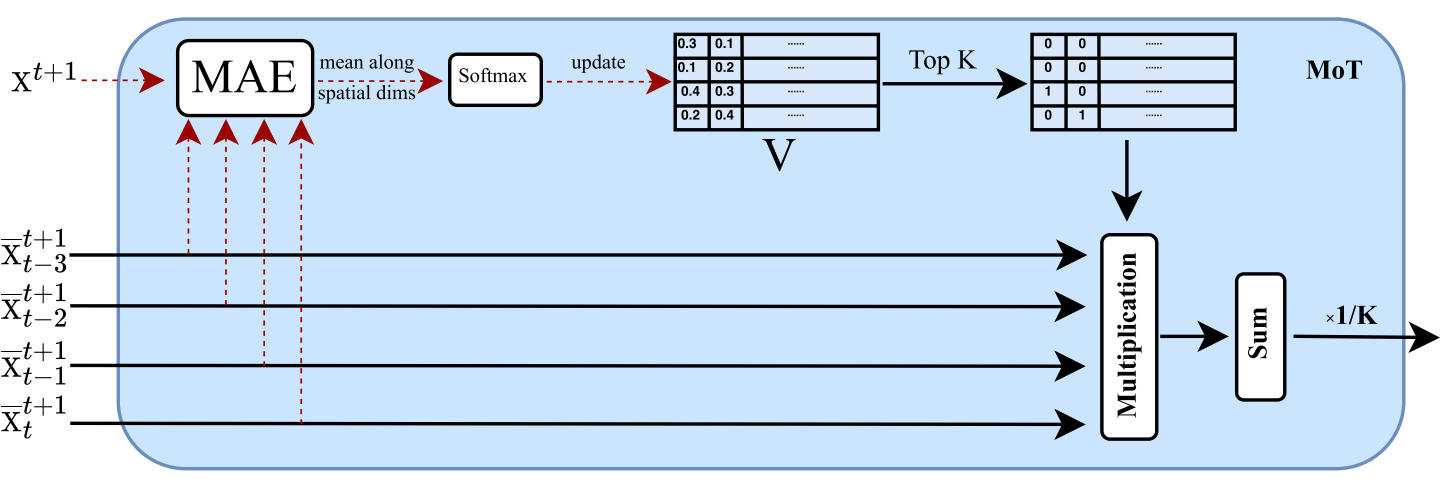 (2)Mixture-of-Time(MoT)模块: 通过通道级自适应选择,融合多个时间窗口的预测结果,减轻序列预报中的误差累积。实现机制: