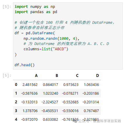 # 创建一个包含 100 行和 4 列随机数的 DataFrame,随机数来自标准正态分布