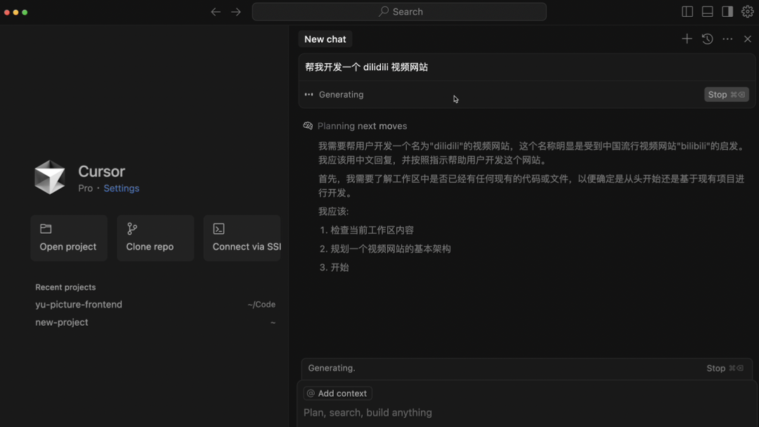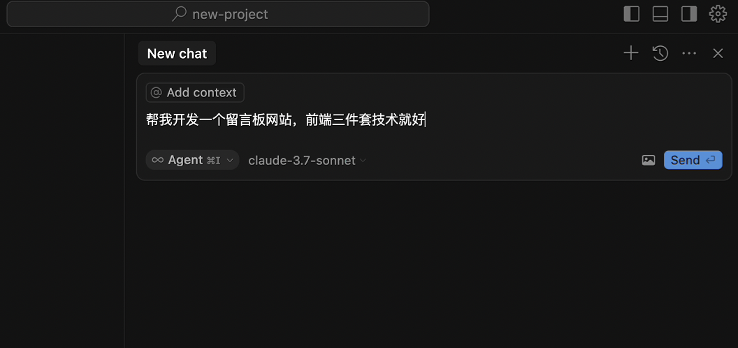 如果要开发小项目或新项目,我建议使用 Cursor,一款专为编程打造的 AI 工具。新建一个文件夹,打开 AI 对话框,选择 Agent 智能体模式和大模型,然后输入一段提示词,接下来只需默默等待,AI 就会自主帮你生成一个完整的网站,真的一行代码都不用写!