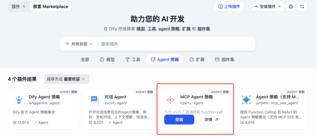 简单来说,利用 MCP 服务,我们可以更方便地给 AI 集成不同的工具和数据,增强 AI 应用的功能。首先安装 MCP Agent 策略,让智能体支持调用 MCP: