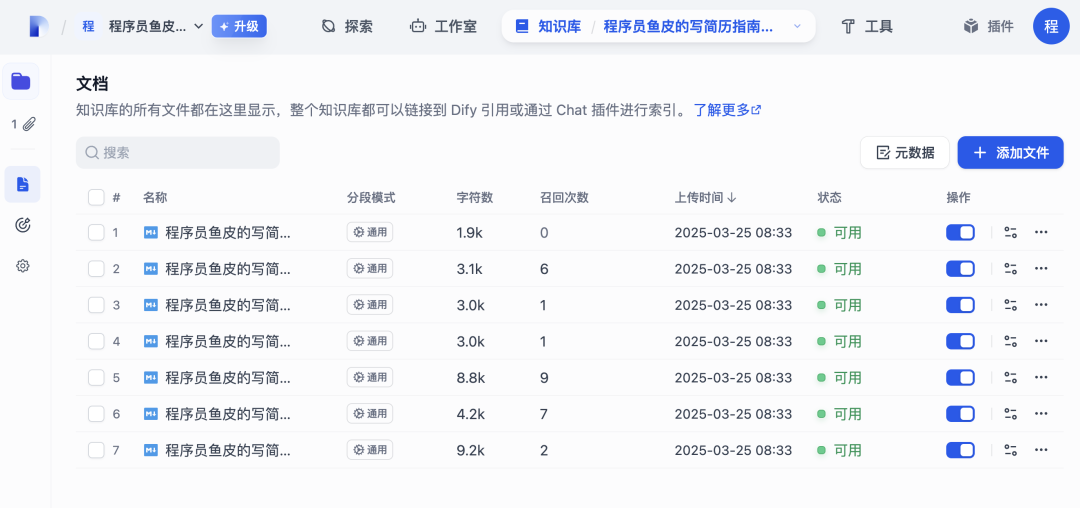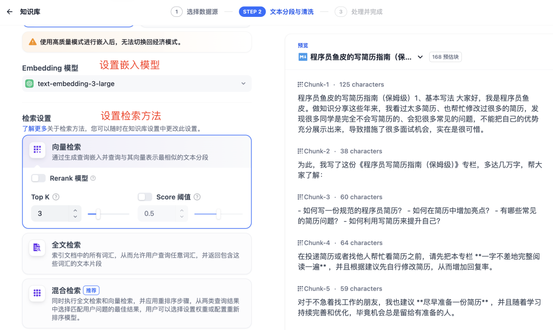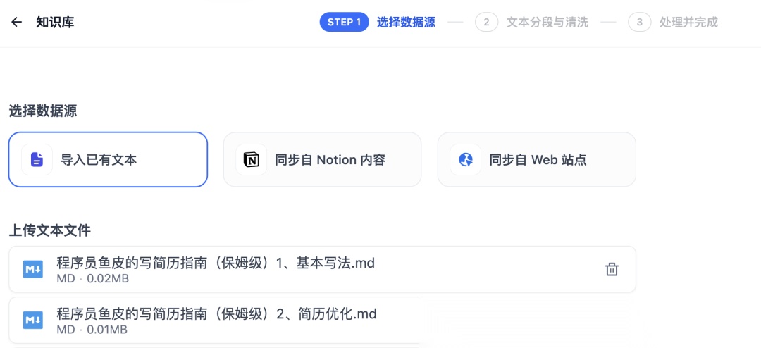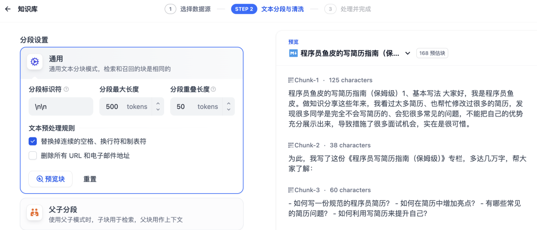 但有时,大模型可能缺少了某些信息,比如让 AI 总结鱼皮写的《保姆级写简历指南》,它给的信息就不准确,怎么办呢?我们可以开启知识库功能,背后是 RAG 检索增强生成 技术,来利用外部知识库给 AI 补充知识。