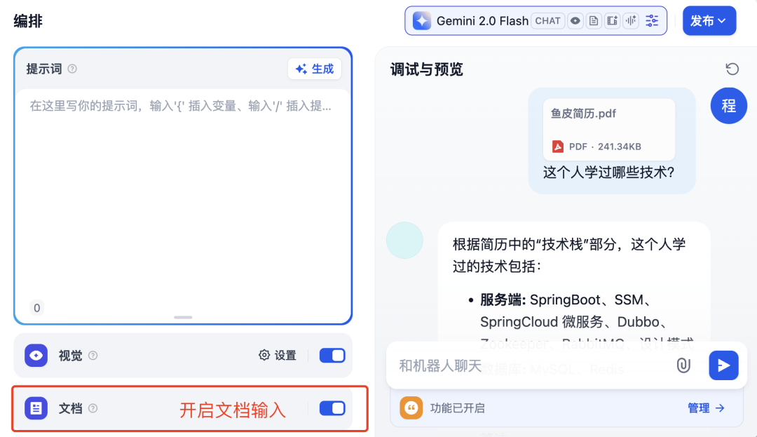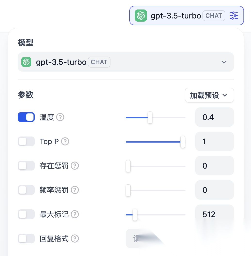 选择大模型后,我们可以设置参数来调整大模型的输出,比如 温度 可以控制模型输出的随机性,温度值越高,模型输出越随机多样;温度值越低,输出越确定保守。
