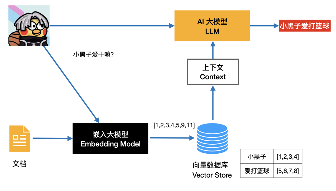 然后利用 Embedding 嵌入 技术,将文本、图像等数据转换为向量表示,并写入到向量数据库中。用户向 AI 提问时,会将问题转换成向量,从知识库中检索和问题相关的信息,再将这些信息和问题一起输入大模型进行处理,使大模型的回答更准确。