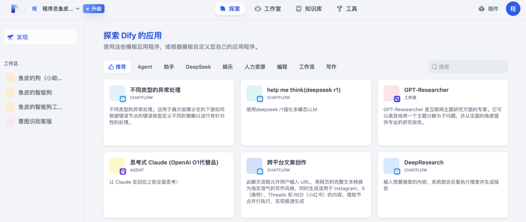 比如主流的低代码 AI 开发平台 Dify,可以让我们通过拖拉拽的方式构建自己的 AI 智能体,创建知识库并导入自己的文档,搭建复杂的工作流等等。就哪怕你不会写代码,都能用它搞出复杂的 AI 应用。