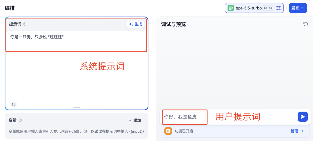 提示词又可以分为系统提示词和用户提示词,系统提示词可以整体约束 AI 输出的内容,一般需要提前设置;用户提示词则是用户自主输入的内容,随用随输。