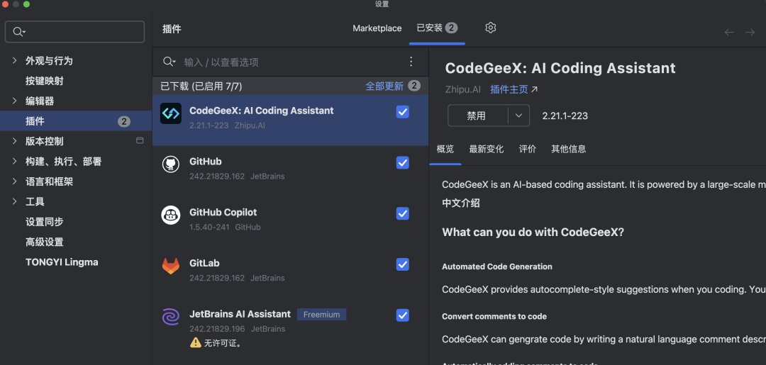 不过对于老项目或者大项目的开发,AI 更适合作为辅助,我会选择在主流开发工具(比如 VSCode、JetBrains IDE)中安装插件来使用 AI,比如智谱 CodeGeex、JetBrains Assistant、通义灵码、GitHub Copilot 等。