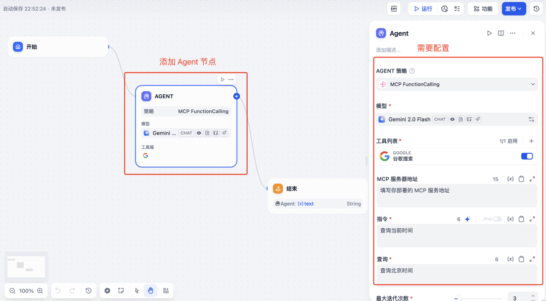 再回到智能体工作流中,填写 MCP 服务器地址、调用 MCP 的指令和查询条件等信息,AI 就可以在需要的时候向 MCP 发送请求来完成数据啦。