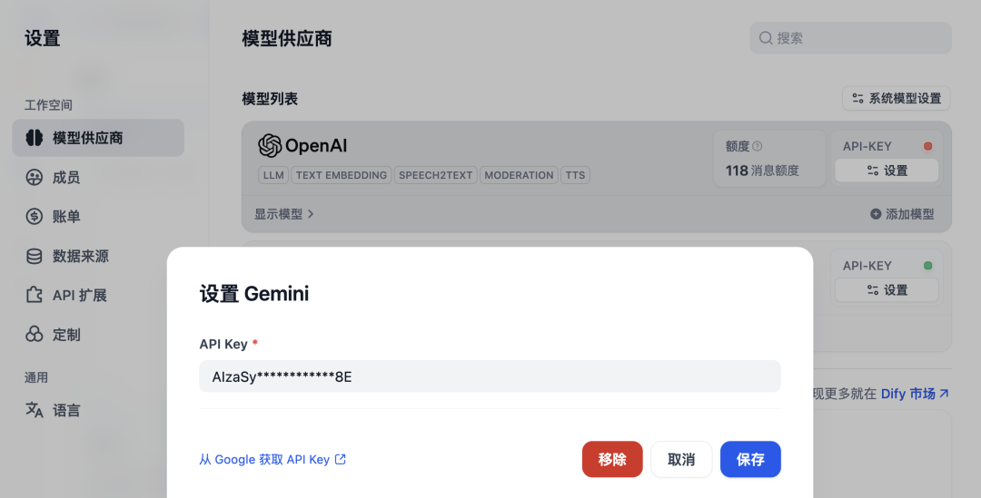 让我们再来添加一个大模型,谷歌的 Gemini,这次它让我输入 API Key,不让我免费用了。没事,我们去大模型官方去申请一个调用秘钥,输入过来即可,之后的每次扣费都会记在这个 API Key 上。
