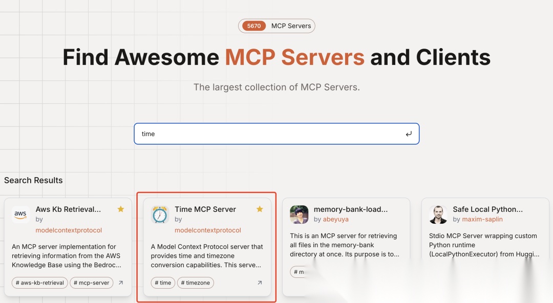 然后可以去 MCP 大全网站找到我们需要的 MCP 服务,比如查询当前时间。
