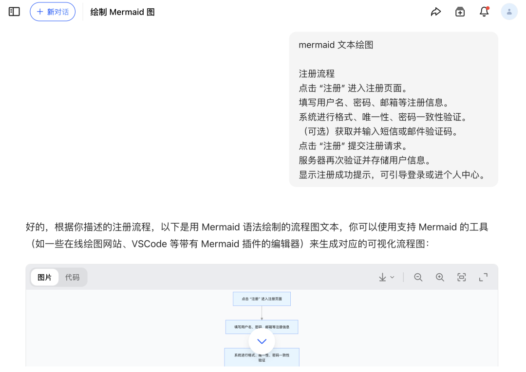 程序员在写技术文档时,一般会通过各种流程图、架构图来让文档更好理解,看起来也更高大上。有了 AI 后,很多图例不用自己手绘了,我可以直接把作图的信息提供给豆包或者其他 AI,让它生成 Mermaid 文本作图语法,接下来就可以直接下载图片、或者把生成的代码放到 Mermaid 渲染工具中,就搞定了,非常方便。